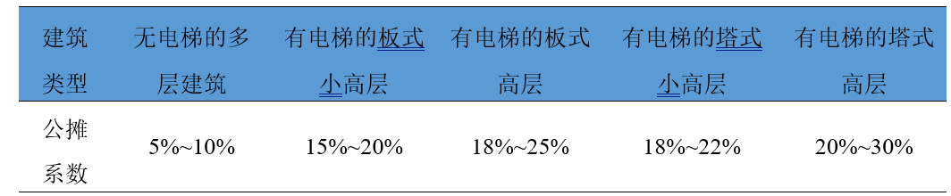 内地住房“公摊”,直观地理解,是指套内面积之外的公用建筑面积。根据1995年原建设部发布的《商品房销售面积计算及公用建筑面积分摊规则(试行)》(以下简称《规则》)的相关规定,公用建筑面积具体包括电梯井、楼梯间等功能上为整栋建筑服务的公共用房和管理用房等。在预售制下,“公摊”面积首先由设计单位在图纸阶段进行初步测算,随后由主管部门对“公摊”面积的合理性进行评估,房屋竣工后由专门的房屋测绘机构对实际“公摊”面积进行测绘。一般将整栋建筑物的公用建筑面积除以整栋建筑物的各套住宅套内建筑面积之和,得到公用建筑面积分摊系数。各套(单元)的套内建筑面积乘以上述分摊系数,得到购房者应合理分摊的公用建筑面积,不同类型的建筑“公摊”系数会有所区别(表1)。当用包含“公摊”的建筑面积计价时,“公摊”作为“由外而内”的计价规则的本质就开始显露。