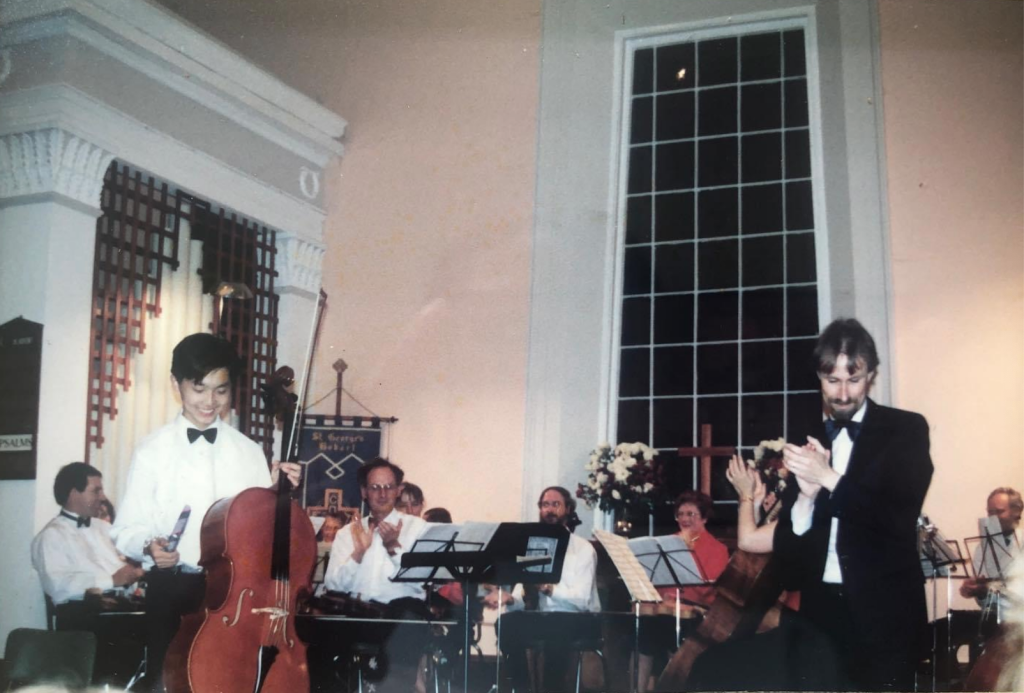2002年,秦立巍和指挥家张国勇、上海交响乐团排练