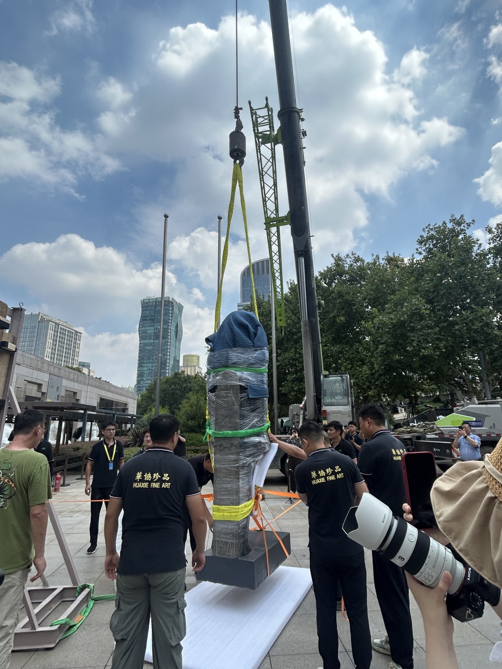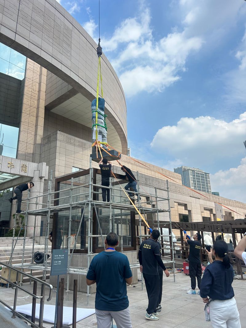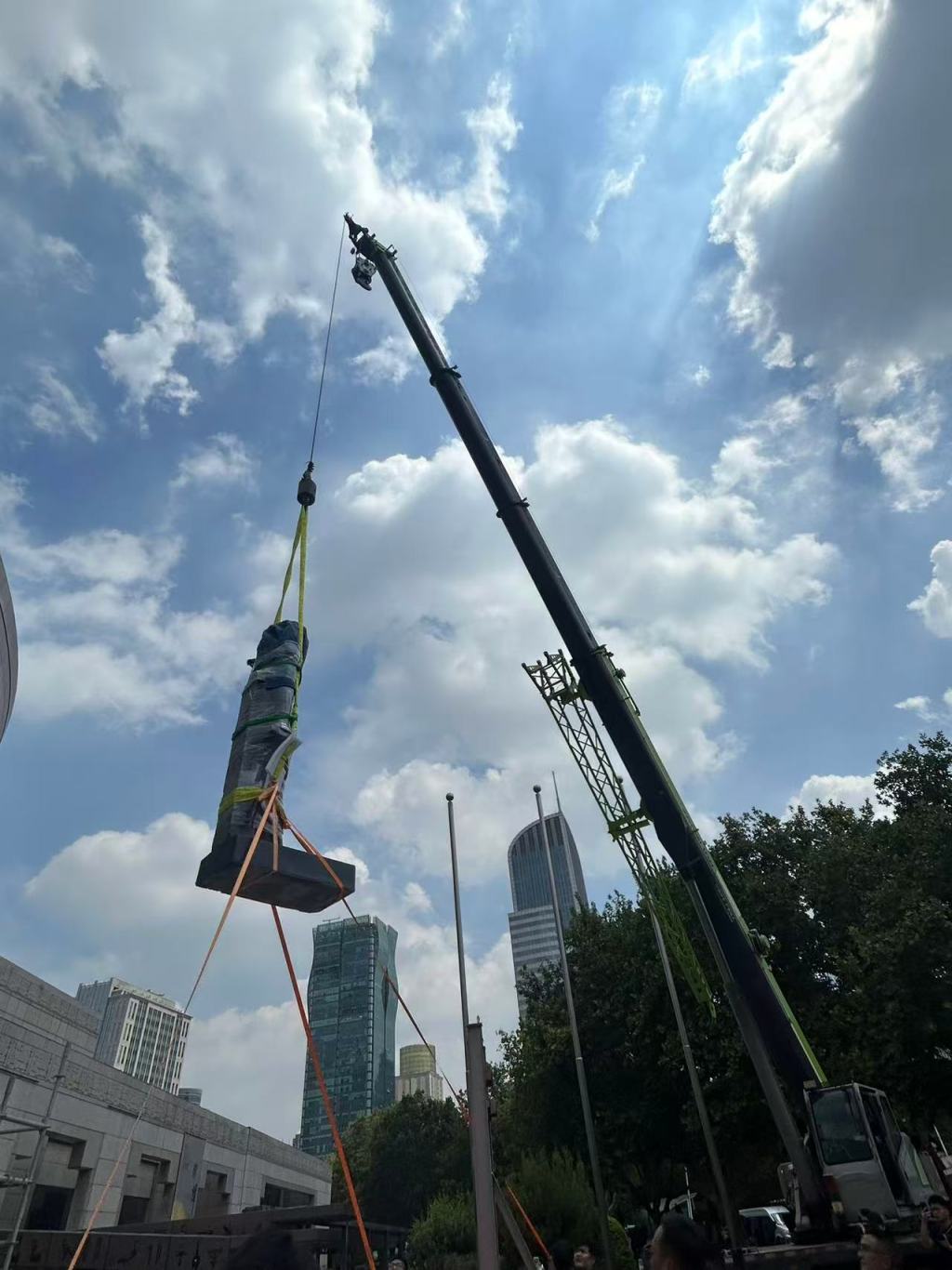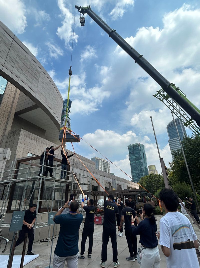 在现场看到,第一次缓慢试吊时,由于重心不稳,雕塑略有晃动,工作人员立即返工,重新找重心、绑井绳,直至文物可以“纹丝不晃”直立着被缓缓吊起、移出玻璃保护罩。整个过程持续了整整3小时。