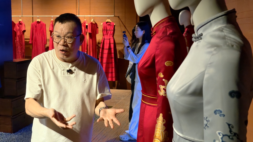 8月21日,曾凤飞介绍他设计的国潮服装。 记者 王珏玮 图