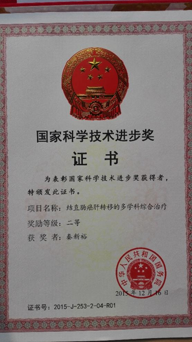 2015年“结直肠癌肝转移的多学科综合治疗”获得国家科学技术进步奖的证书。