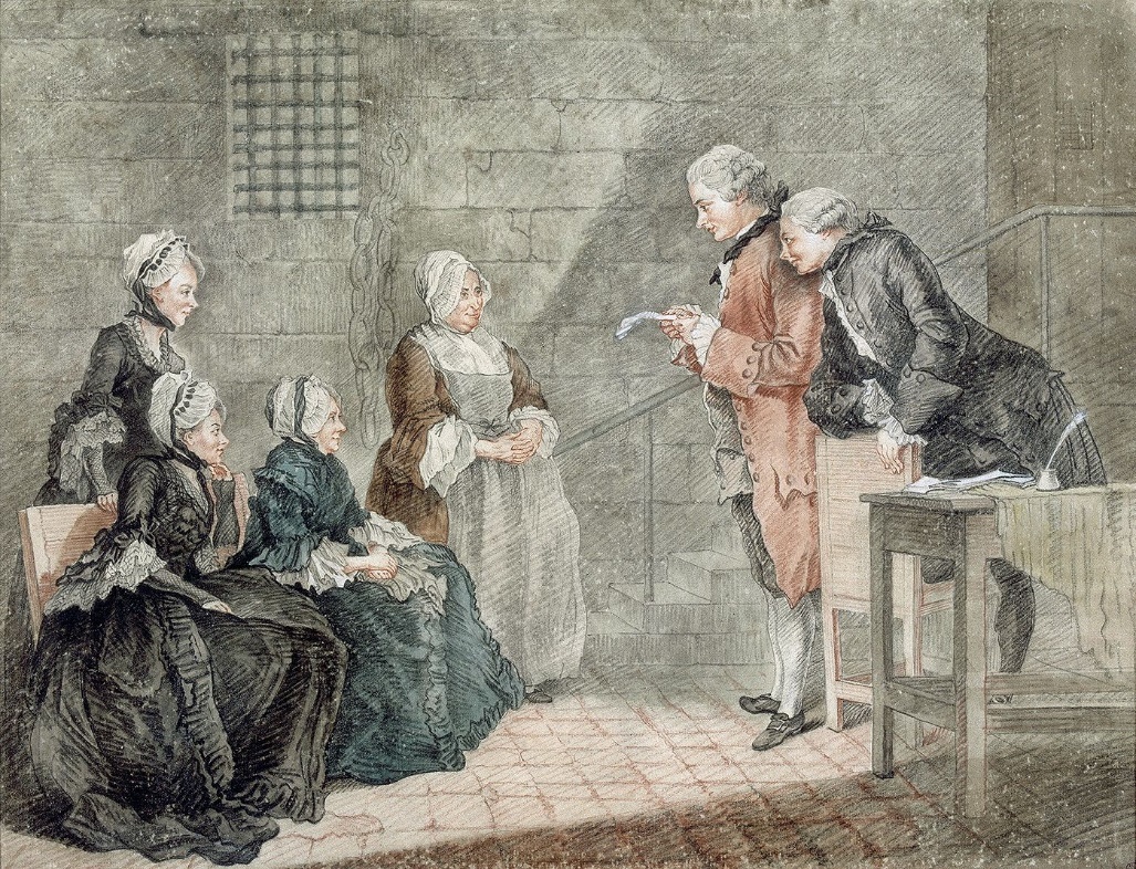 《不幸的卡拉斯一家》,卡蒙特勒(Louis Carrogis Carmontelle)作,1765年,卢浮宫藏。图中描绘了1765年2月案件重审时,卡拉斯一家因受控而被暂时拘禁于巴黎的贡西尔日里监狱(Conciergerie),皮埃尔·卡拉斯及友人奥贝尔·拉维斯向其家人宣读律师埃利·德·博蒙写的辩护状。