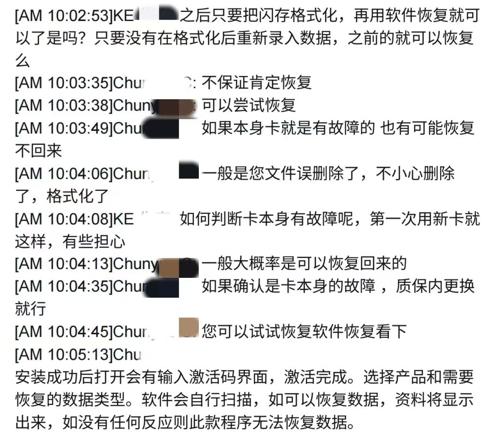 10月14日,朱先生联系闪迪中国官方在线技术支持寻求帮助。工作人员向朱先生提供了一个新的恢复软件链接,并建议朱先生格式化存储卡并通过该软件找回数据。