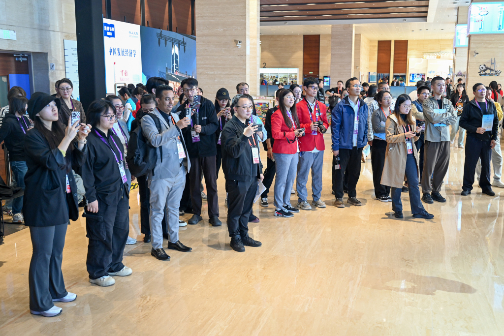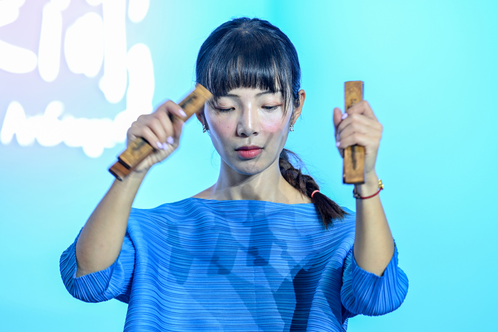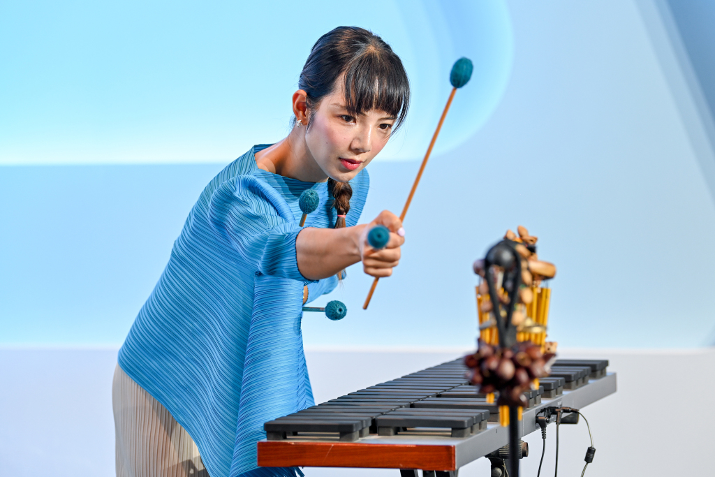 2025年11月5日,国家会展中心(上海),打击乐演奏家荣辰初在新闻中心艺术空间表演。记者 朱伟辉 图