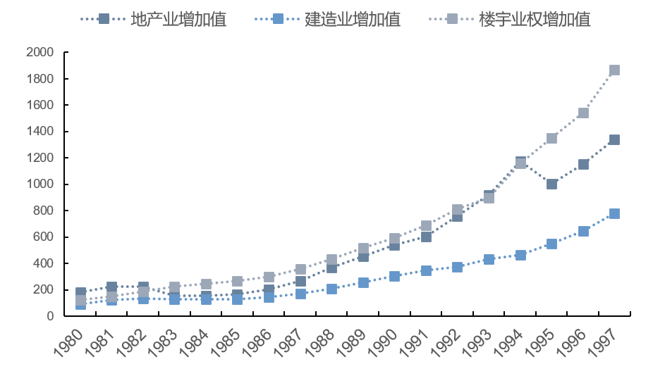 图2 香港地产业、建造业、楼宇业权增加值(1980-1997)。资料来源:香港特区政府统计处《二零零二年本地生产总值》
