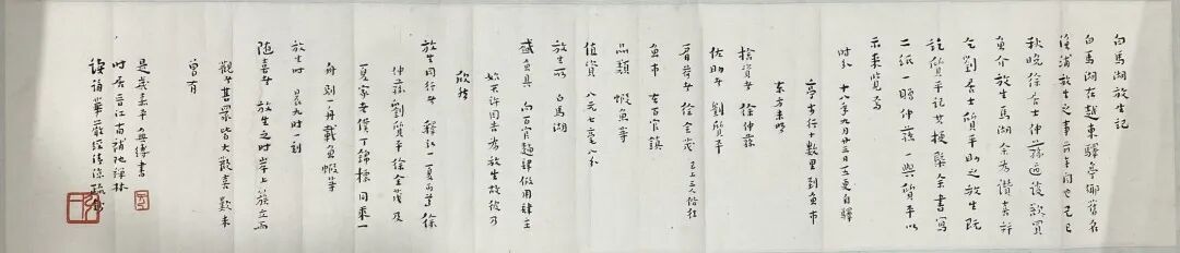另一件平湖李叔同纪念馆藏的《白马湖放生记》,尤为珍贵。这件文物背后有一个温暖的故事:李叔同好友为弥补其幼年失亲之憾,在他50岁生日时特意为他举办庆生活动,并在白马湖发起“放生”活动。这一行动被李叔同记录在《白马湖放生记》中,展现了友人间的深切关怀。