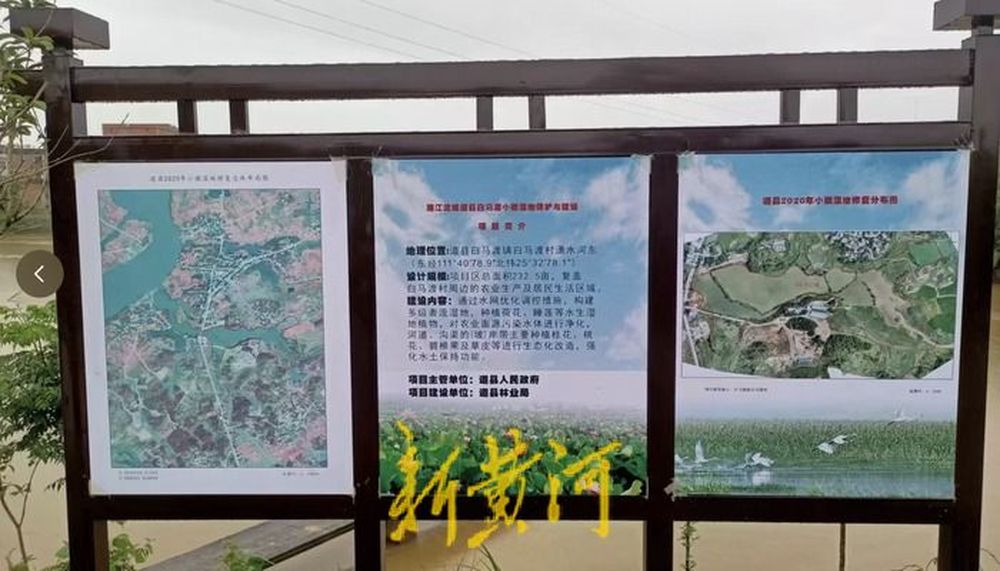 吴耀都给新黄河记者展示了涉案地块周边的一个展示牌,展示牌上显示,包含涉案地点在内的整个坑塘水域230余亩已被划为白马渡小微湿地项目,该项目主管单位为道县人民政府。据红星新闻报道,一份由白马渡村村委会撰写、白马渡镇镇政府呈报、道县政府某领导签字支持的请示显示,该村因受水淹影响,内水水面宽,是打造乡村农业、休闲观光的绝佳基地,拟规划建设白马渡镇渔业养殖休闲观光基地示范项目,打造全县最大规模的休闲观光重要示范基地。根据该文件,该项目基地建设内容为对现有水面拓宽、加深、围堤砌护坡,建设休闲观光步行道等。