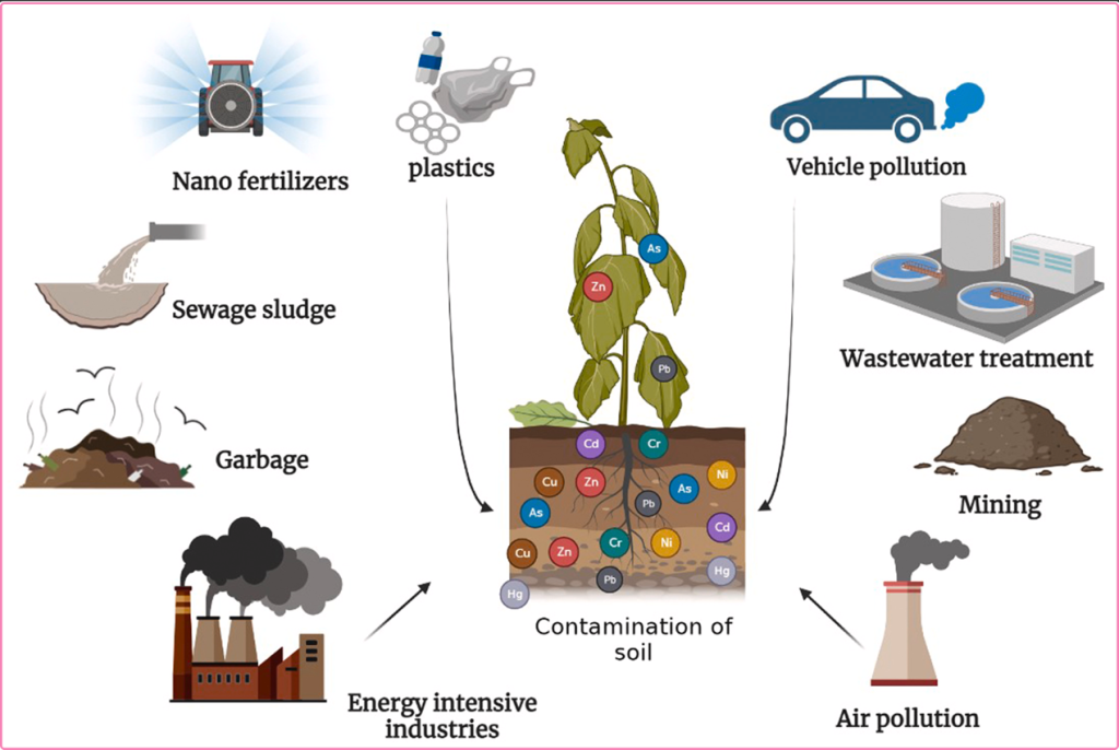 与自然来源相比,农业土壤环境中重金属的浓度因人类活动而增加,且影响更为显著,如例如冶炼和采矿、燃烧化石燃料、处理城市垃圾、施肥、使用农药和灌溉污水。其中,磷肥、生物肥料和石灰材料常含有较高浓度的重金属,农药滥用则进一步加剧土壤与水体的污染负荷。
