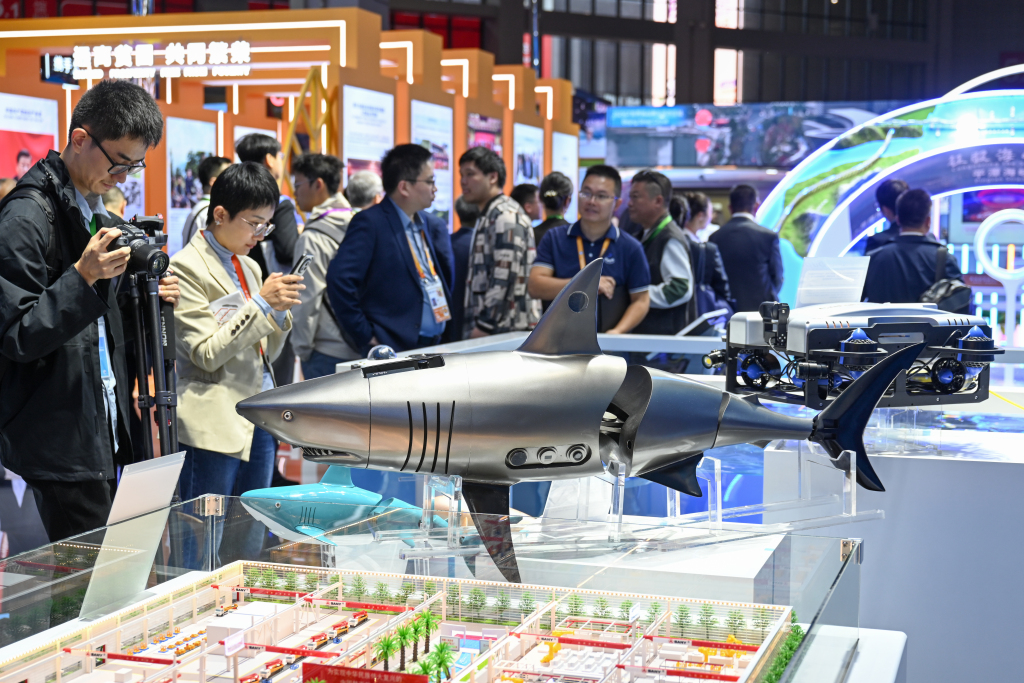 一款中型仿生机器鱼。搭载AI导航和避障系统,可以胜任大范围隐蔽水文监测,水下精细化测绘及持续侦察任务。记者 朱伟辉 图