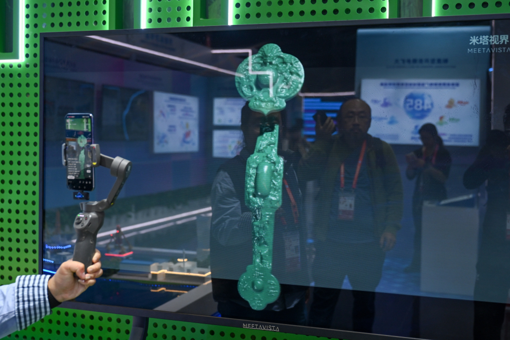 米塔视界的无介质空中成像。影像真实悬浮于空气中,无需屏幕或佩戴设备,支持手势、语音交互,动态展示展品结构拆解、工艺流程与历史演变,实现虚实结合的沉浸式空间叙事。记者 朱伟辉 图