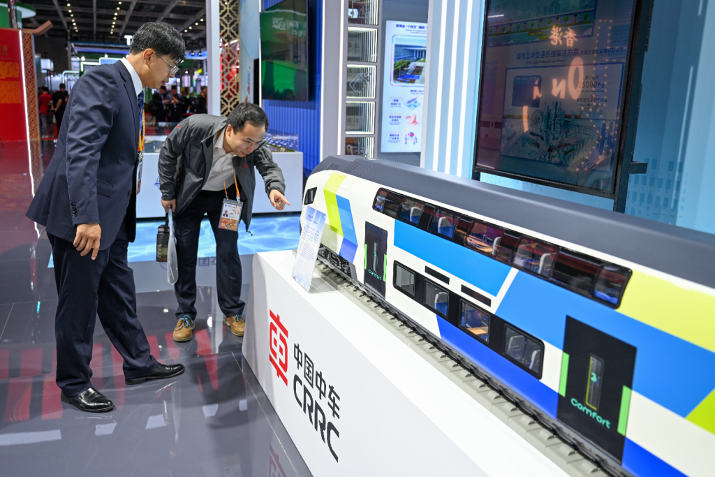 参展商在观看中国中车的轻型磁浮列车。记者 朱伟辉 图