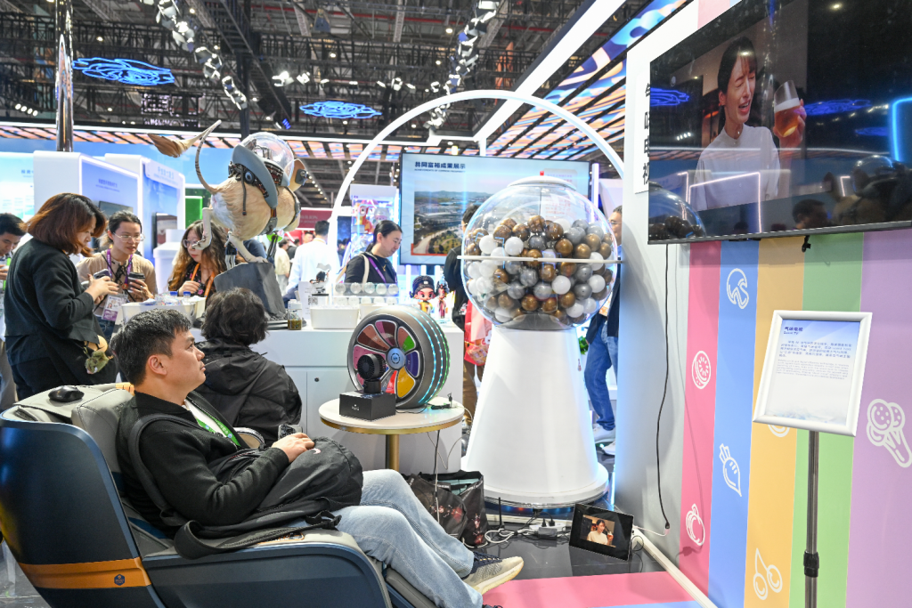 参展商在体验气味电视。气味电视依托 AI 与气味数字化技术,居家观影时实时接收影片,直播气味信号,联动 scent host 精准释放对应气味,还原目的地烟火气与风情,让“云游”有嗅觉、更具沉浸感。记者 朱伟辉 图
