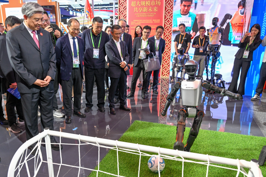 踢球机器人吸引了众多展商。记者 朱伟辉 图