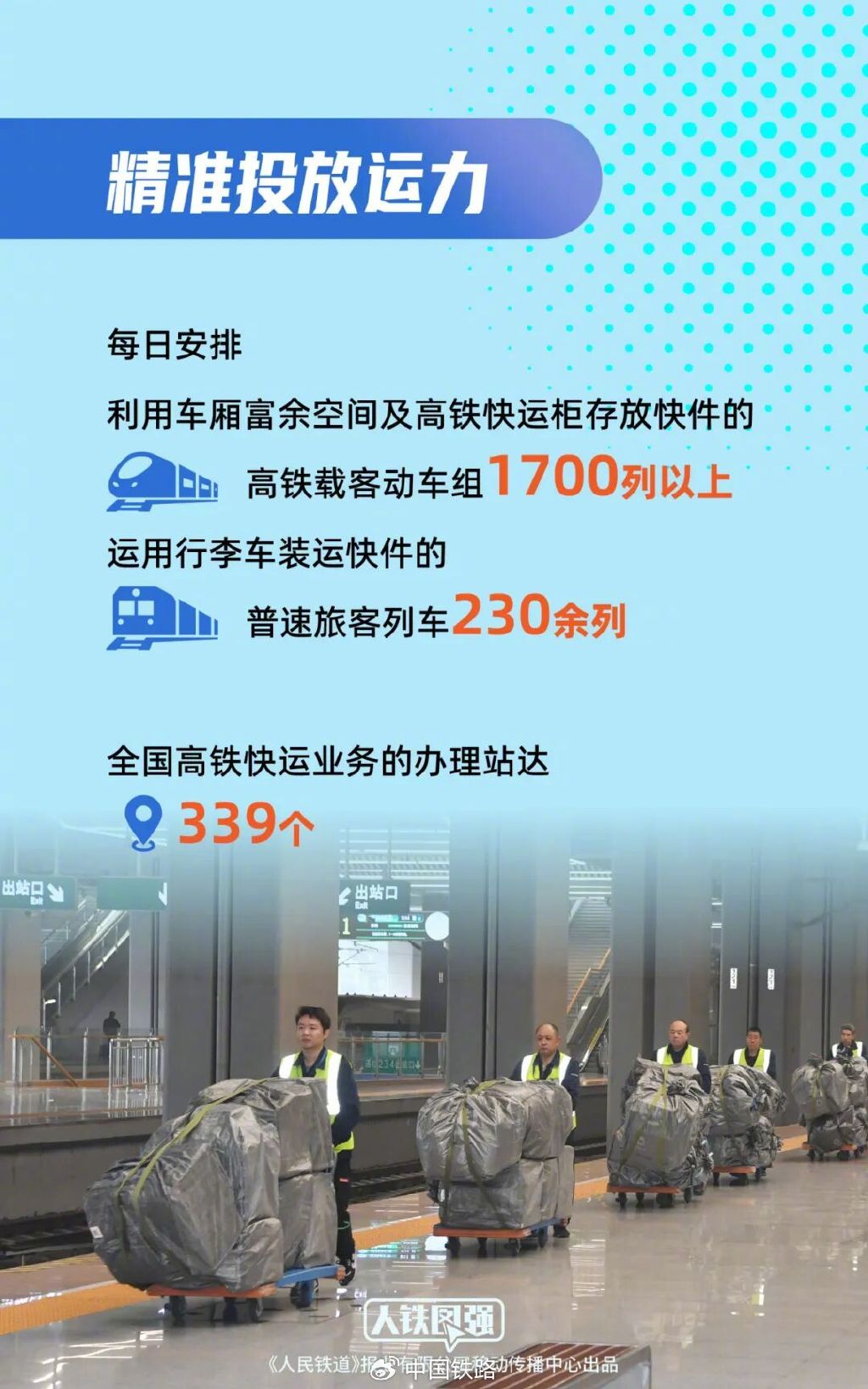 一是精准投放运力。每日安排利用车厢富余空间及高铁快运柜存放快件的高铁载客动车组1700列以上,设有快件预留车厢的动车组约50列,清晨开行、全列无乘客、可装运快件的高铁确认列车37列,昆明至成都间整列高铁快运列车2列,开展高铁快运服务,高铁快运能力预计同比增长10%。每日安排运用行李车装运快件的普速旅客列车230余列。在北京、上海、杭州、广州等城市间每日安排开行最高时速160公里的特快班列8列,在沈阳至广州、广州至乌鲁木齐等城市间开行多条快速班列和普速班列,开展铁路快运服务。优化站点布局和资源配置,在镇江站、日照站、长白山西站等增办高铁快运业务,全国高铁快运业务的办理站达339个。