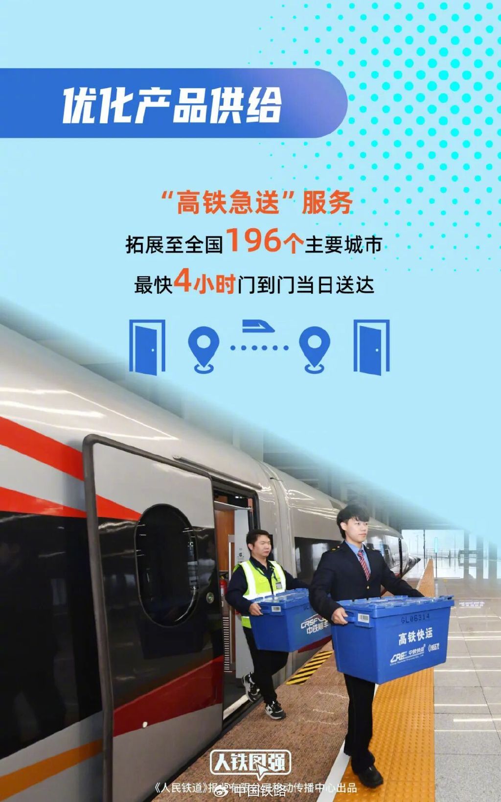 二是优化产品供给。将“高铁急送”服务拓展至全国196个主要城市,采用即收、即运、即送方式,优先装运、保障时效,客户可实现“足不出户、微信小程序下单,最快4小时门到门当日送达”。针对生鲜食材、果蔬、3C数码等产品运输,制定个性化运输方案,满足差异化物流需求。针对安全要求高、保密要求高的货物,提供“高铁专人送”服务,专人手提、全程押运、专车取送,更好地满足客户差异化、个性化物流需求。针对温控药品、检测试剂、生物样本等冷链产品运输,采用先进可靠的制冷设施设备和蓄冷包装,实行全程控温,确保运输品质。