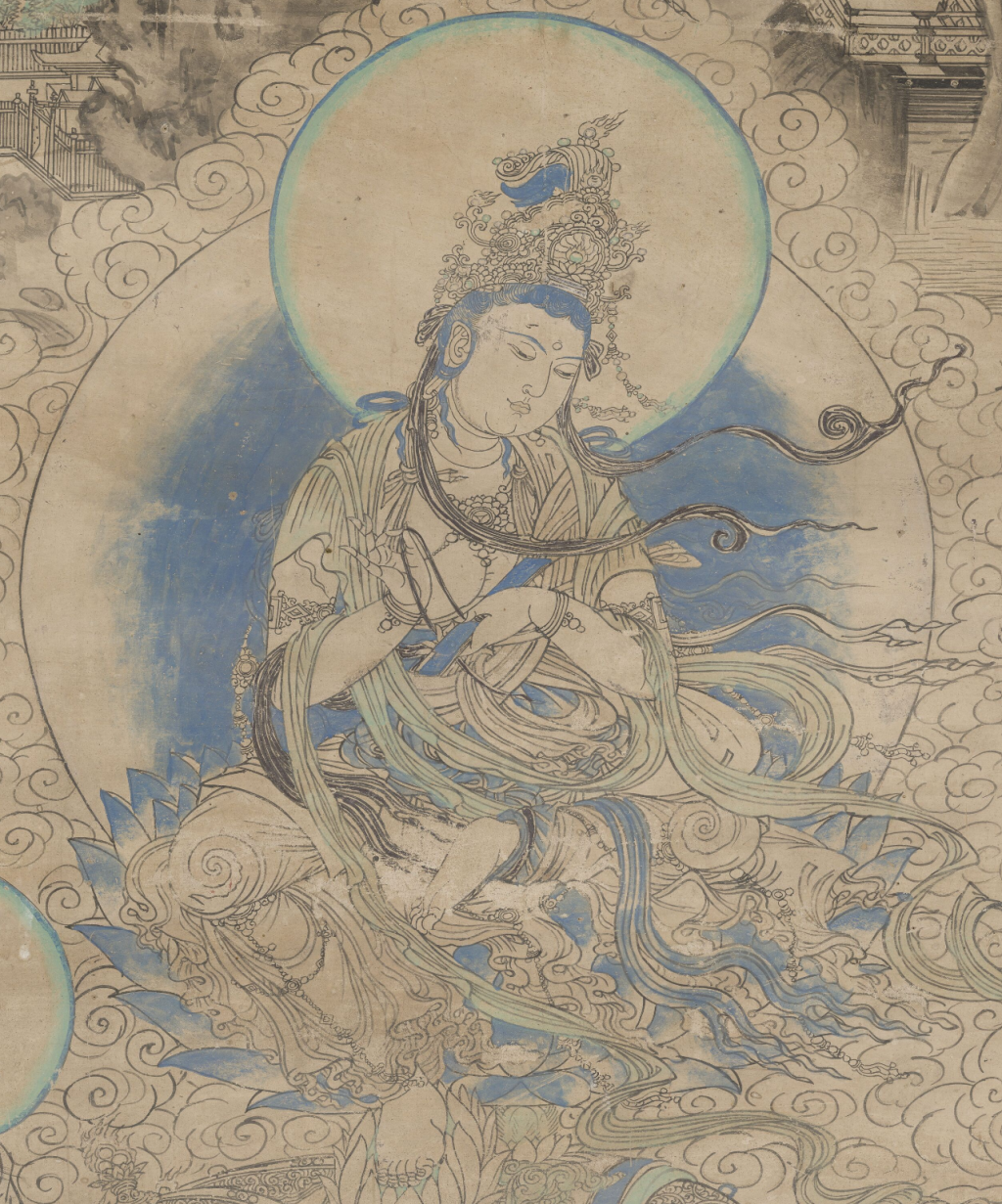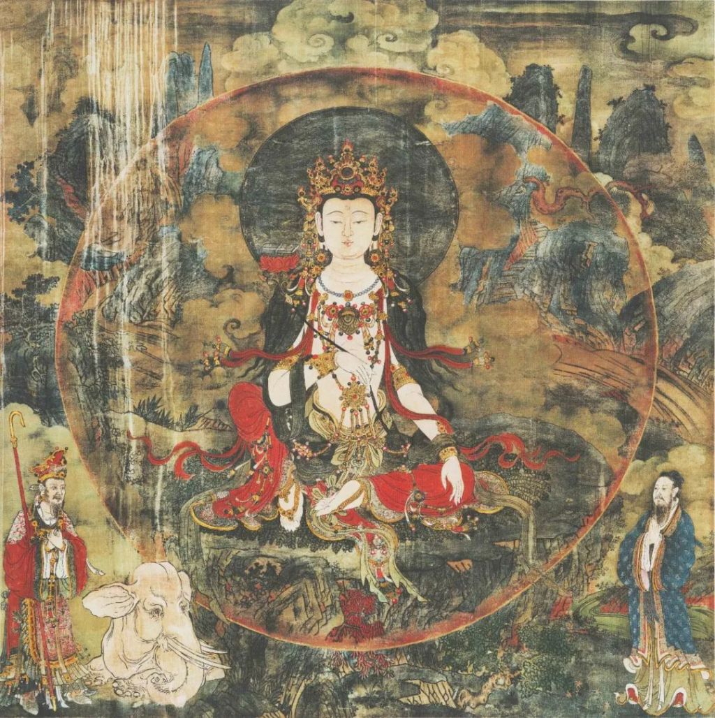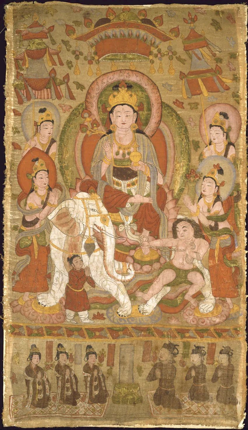 巴黎吉美国立亚洲艺术博物馆藏的《北宋绢画普贤菩萨图》,乃是敦煌莫高窟第17窟出土的绢本设色画,高82.5公分、宽47公分,不足一平米的画面,依然让我们感到富丽堂皇:普贤菩萨头顶的华盖坠着金饰,菩萨头戴宝冠,自在地乘坐在六牙白象上,左手托着宝瓶,右手执着三朵金色茎莲。身侧有四位胁侍菩萨,二位菩萨撑着随风飘扬的伞盖,一位菩萨双手合十面向普贤,另一位菩萨手捧着花瓶作供养状。象奴正在驯驭大象,象前的善财童子穿汉地的红衣白裤,双手合十,仰视普贤。天雨妙华,白象足下绘着粉红和青色的云朵踏台,带状云气团团而转,普贤菩萨骑着大象从天而降——心空而生妙有。