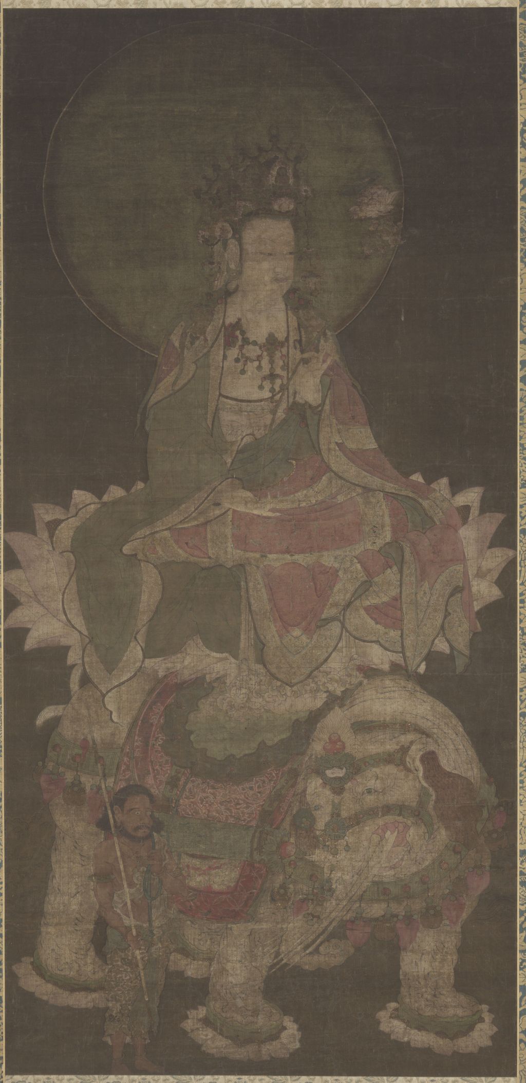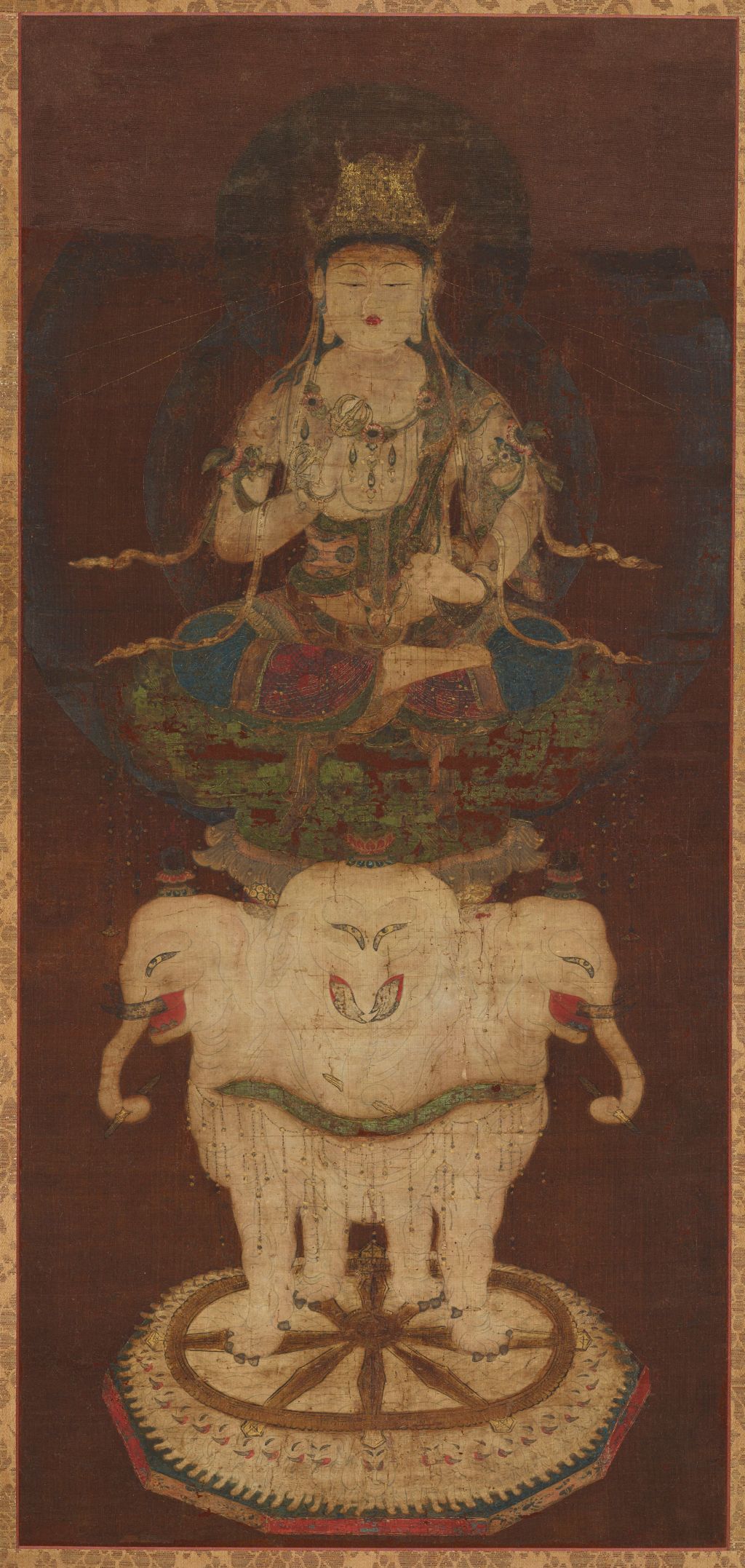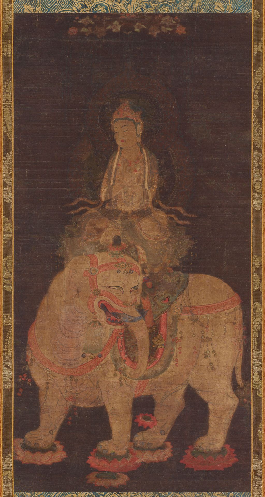 奈良博物馆另有一张普贤菩萨像,绘制于镰仓时期,相当于元代,普贤菩萨的头光和背光形成葫芦形的光圈,外围另有一层未圆的身光,一头大象分身为三,象征着戒定慧三学,大象的四只脚下踏在象架上,象征四摄:布施、爱语、利行、同事;下有千头小象,远看卷底的象眼和象脚,仿佛千瓣莲花,气场巨大,似有千万只象脚踏地的震耳欲聋之声,象征着普贤菩萨的大行大力。
