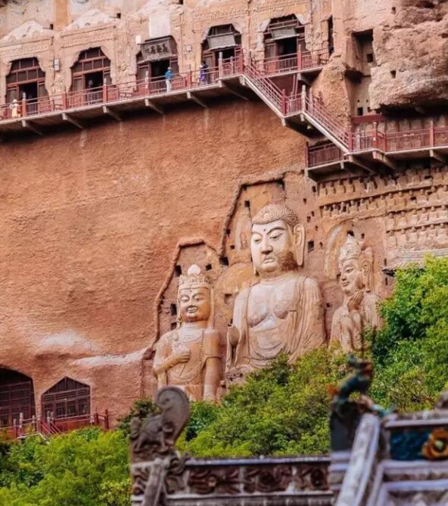 麦积山东崖上第13窟是三尊华严经变——华严三圣:毗卢遮那佛、文殊菩萨、普贤菩萨。开凿于隋代,宋代重修,主尊毗卢遮那佛高15.7米;左右的文殊菩萨和普贤菩萨高13米,依山体而雕刻了莲台,石胎泥塑的三尊像巍然肃穆,气势磅礴,体量巨大,是麦积山外观佛像的中心。该窟普贤菩萨还没有六牙大象在身边,不是所有普贤都骑白象。