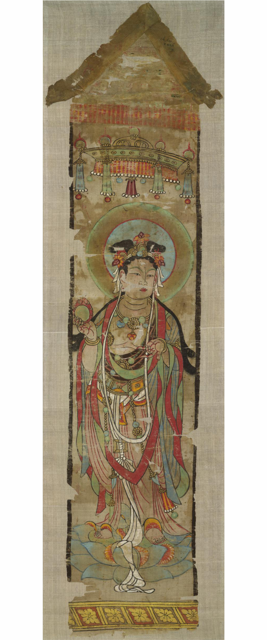 普贤菩萨站像,像幡,绢本设色敦煌,莫高窟藏经洞,中唐(766—835年)尺寸:71X17.5cm,伦敦 大英博物馆藏