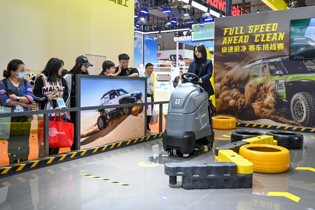 观众在体验卡赫站立式洗地机,直观感受产品的性能和操控体验。记者 朱伟辉 图