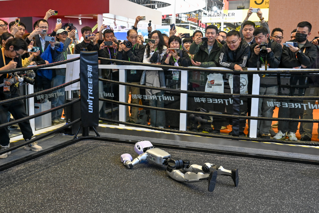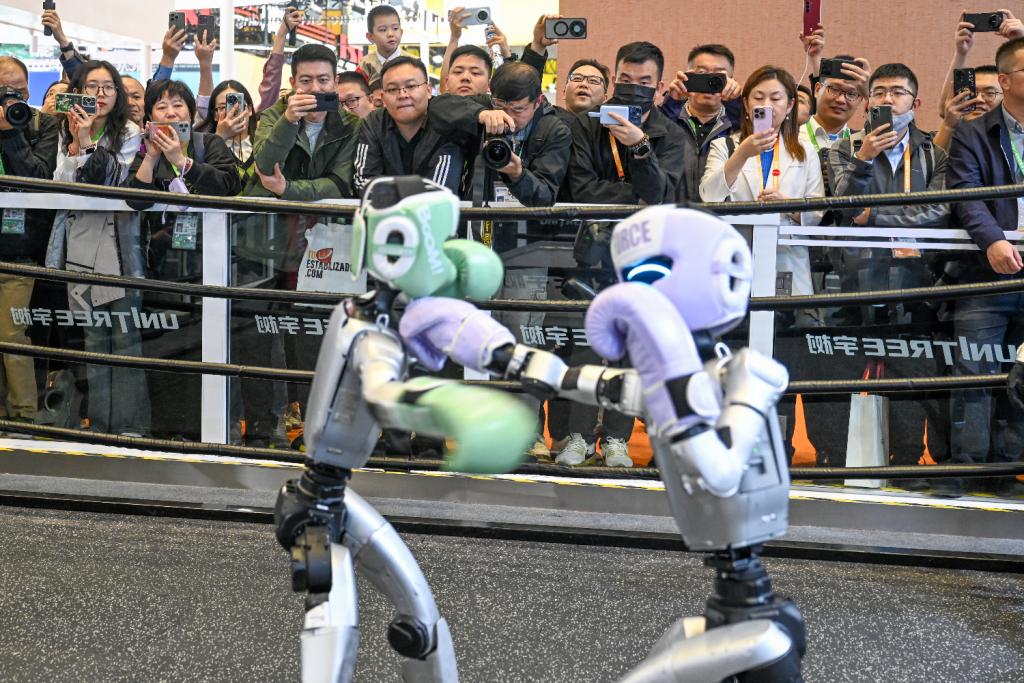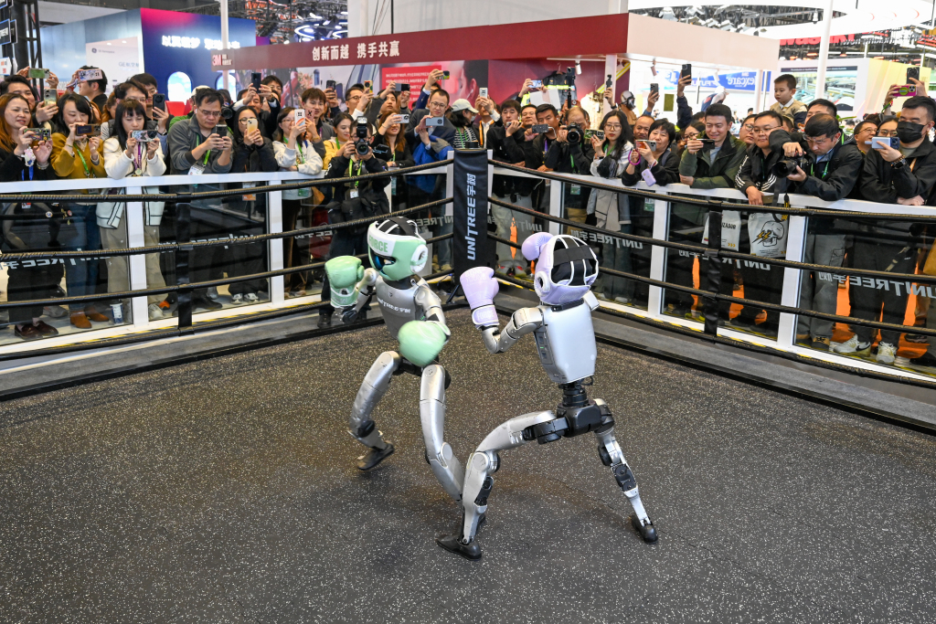 直拳、勾拳、左右鞭腿……2025年11月7日下午,国家会展中心(上海),在技术装备展区宇树科技展台,两台G1人形机器人戴着护具及拳套,它们的格斗表演吸引了众多观众,不时赢来观众的阵阵喝彩和加油。