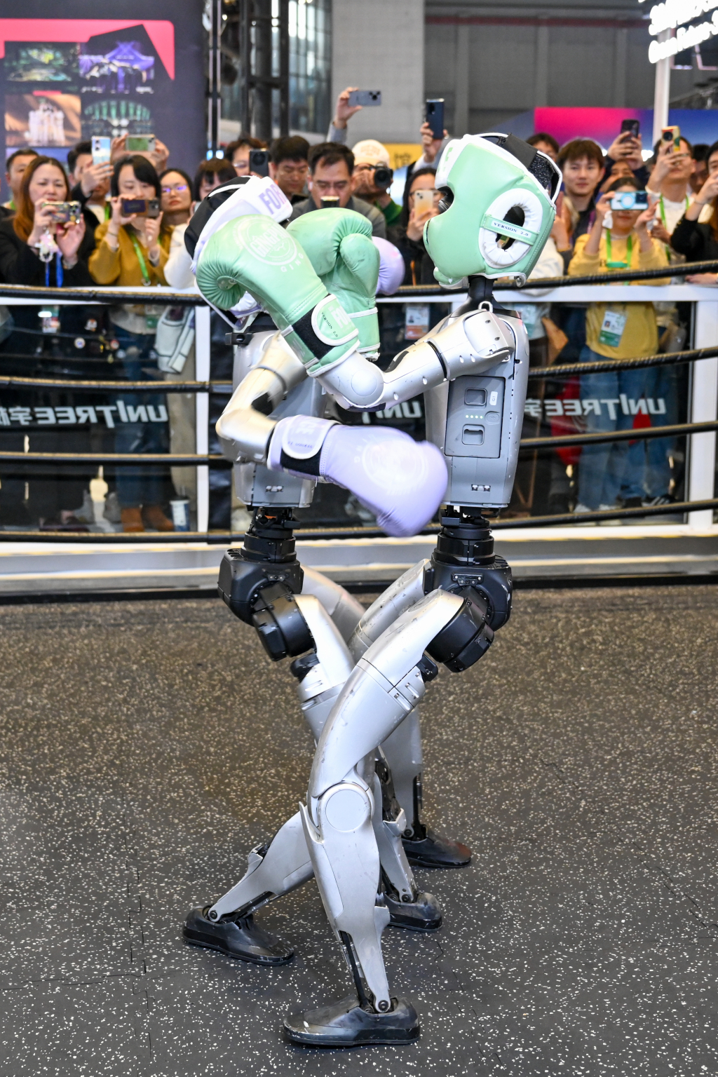 2025年11月7日,国家会展中心(上海),在第八届进博会宇树科技展台,人形机器人进行格斗表演。记者 朱伟辉 图