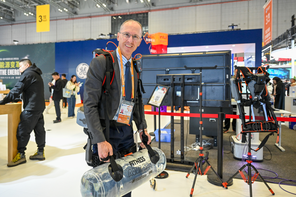 佩戴FIT-U PRO上肢外骨骼机器人的外国展商轻松拿起50斤的物品。FIT-U PRO上肢外骨骼机器人由上肢控制系统、肩部控制系统及总控集成系统组成,为用户的肩部、胳膊进行智能化电助力。产品搭载自研运动控制卡及配套驱动单元,为企业重体力岗位,减轻工人劳动负担50%以上,减少工人流失,提升生产效率提供有力保障。记者 朱伟辉 图