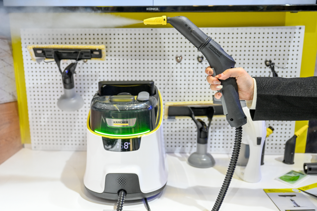工作人员演示卡赫全球首发高温高压蒸汽清洁机CTK 5 Pro。全新一代高温高压蒸汽清洁机CTK 5 Pro系列被注入更多智能元素,除了机身的数码显示屏可展示实时温度及提示缺水,还新增语音播报功能,对机器状态进行实时播报,为中国消费者带来更贴心的清洁体验。搭载卡赫独有的VapoHydro专利封闭式加热系统,可持续输出高饱和的高温高压蒸汽,从而实现高效清洁。与传统的化学消毒方式相比,卡赫高温高压蒸汽清洁机更加绿色环保:整个过程只需水和电,可有效避免因化学剂残留而引起的潜在过敏反应,对有小孩和过敏患者的家庭非常友好。记者 朱伟辉 图