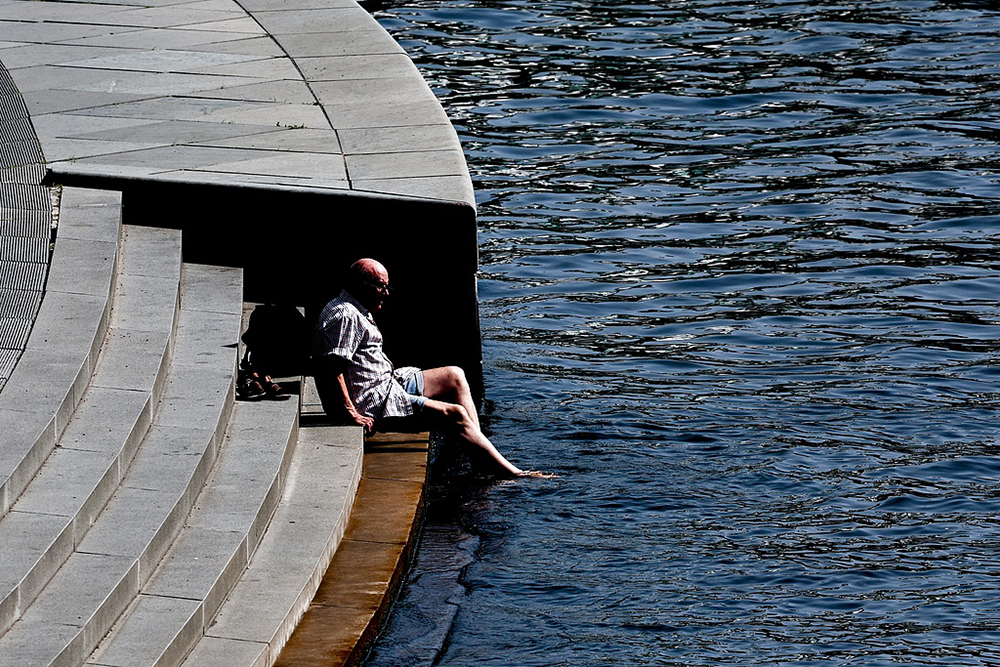 2025年8月14日,德国柏林,政府区施普雷河畔,一名男子在高温预警下纳凉。视觉中国 资料图
