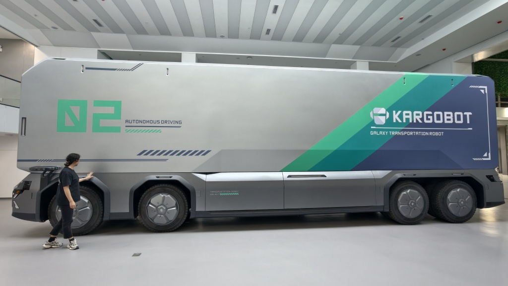 在鄂尔多斯新能源汽车中心隔壁,建有鄂尔多斯市“车路云·未来中心”。展馆外,一队无人驾驶新能源重载卡车引人注目,展馆内还有一辆充满科幻感、甚至没有驾驶室的无人驾驶重载卡车正在展示,如同科幻片里的未来战舰。