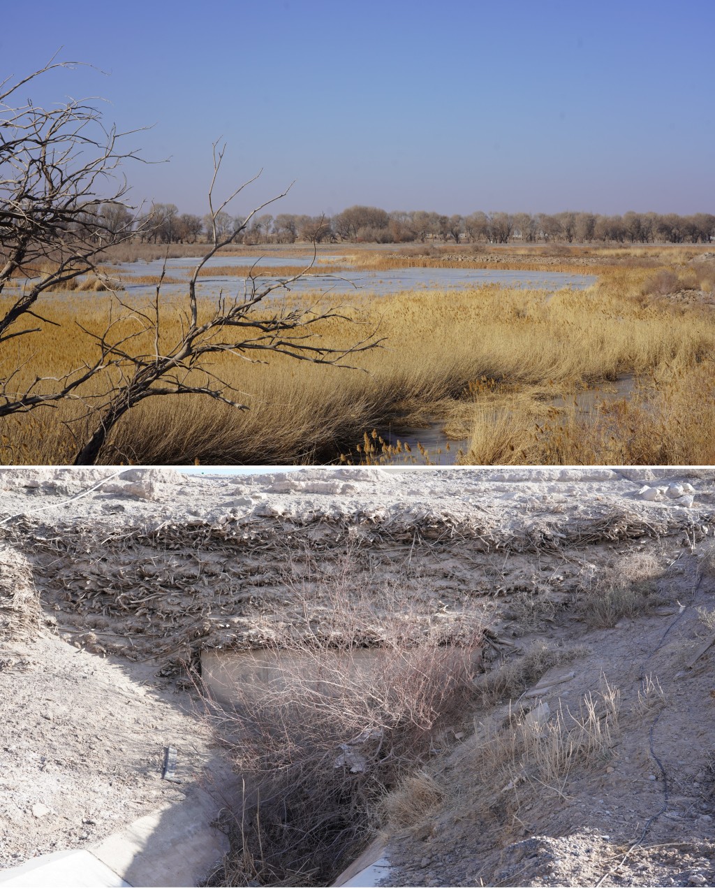图7 上为瓜州县桥子东坝全景,系平原小型水库;下为出水口局部结构,可见红柳沙土堆叠坝体。张景平摄。
