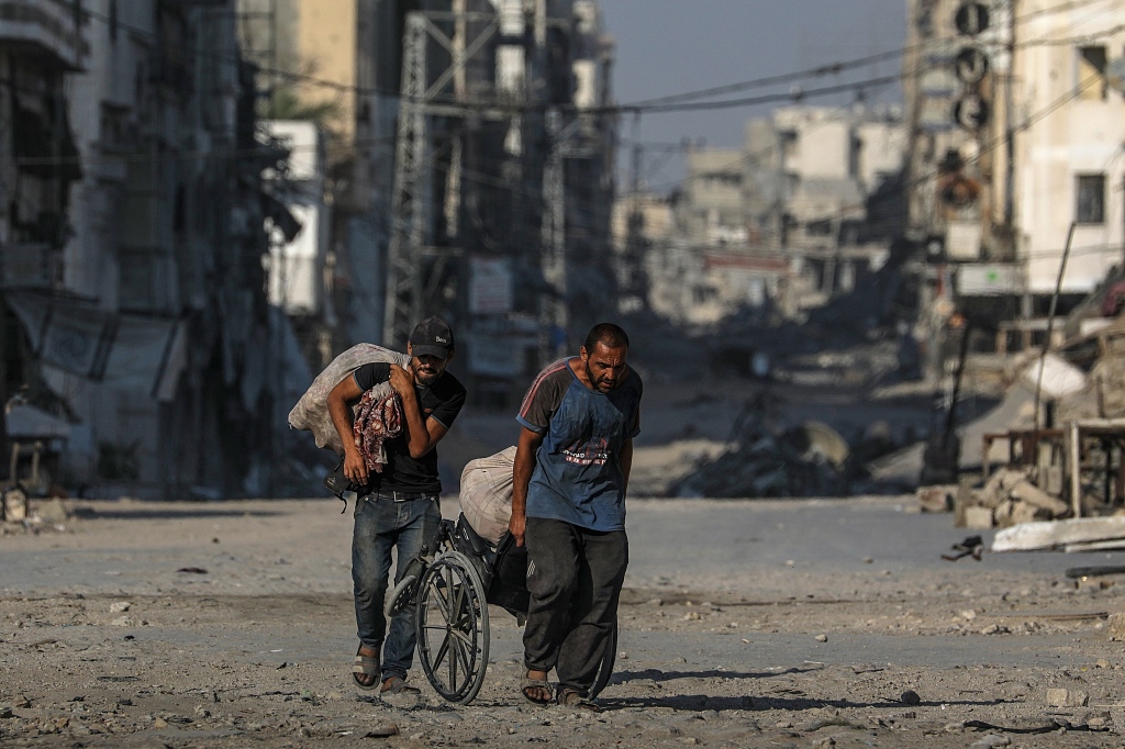 当地时间2025年9月24日,加沙城,流离失所的巴勒斯坦人撤离纳赛尔社区。视觉中国 图