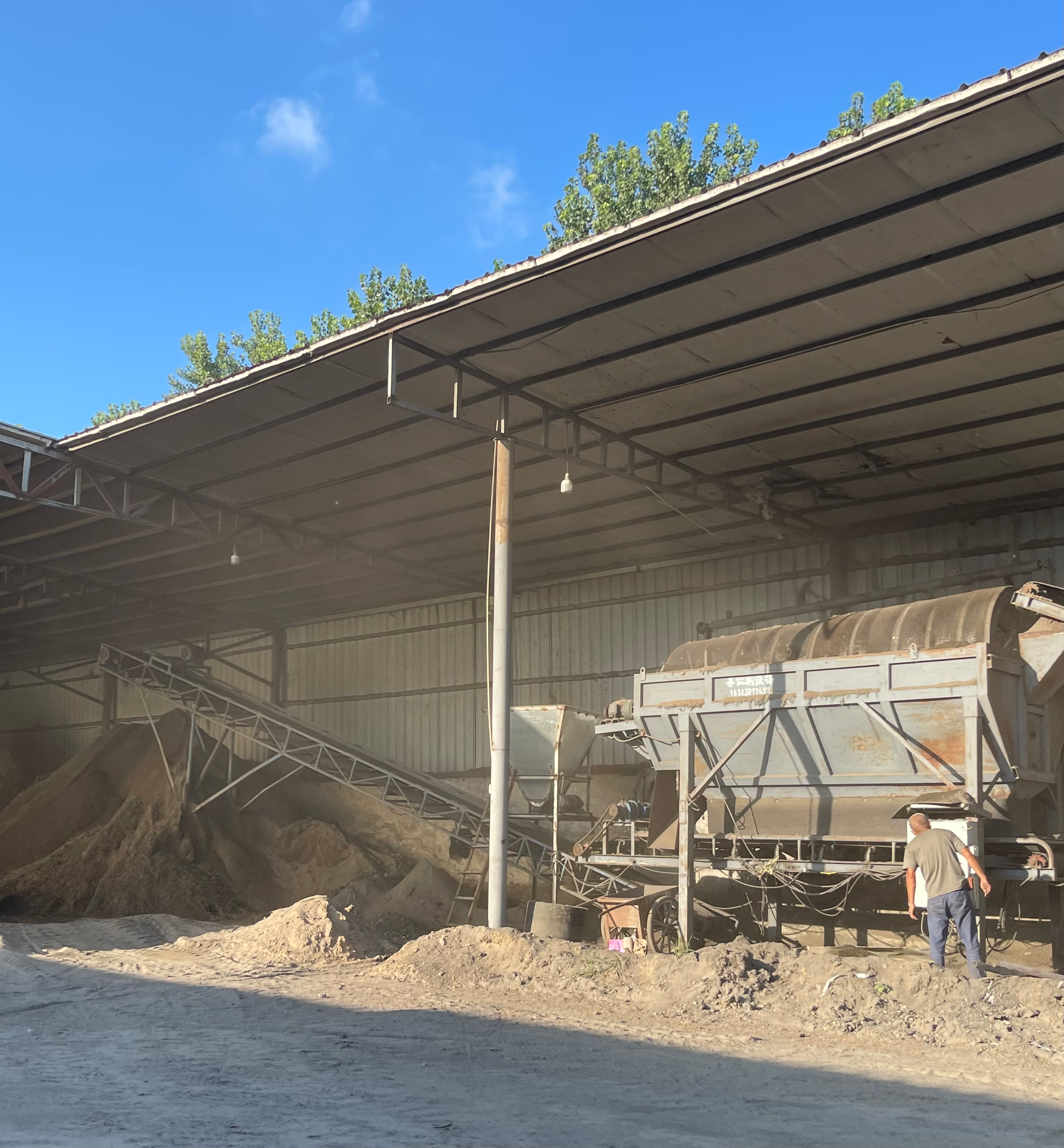在该市淮阴区淮涟村,有一家规模较大的营养土生产厂,由养猪场改建而成,未挂公司牌匾。院内尘土飞扬,挨着大门和栏舍搭建的L型彩钢瓦顶下,堆着成山的沙泥状土,机器轰鸣。