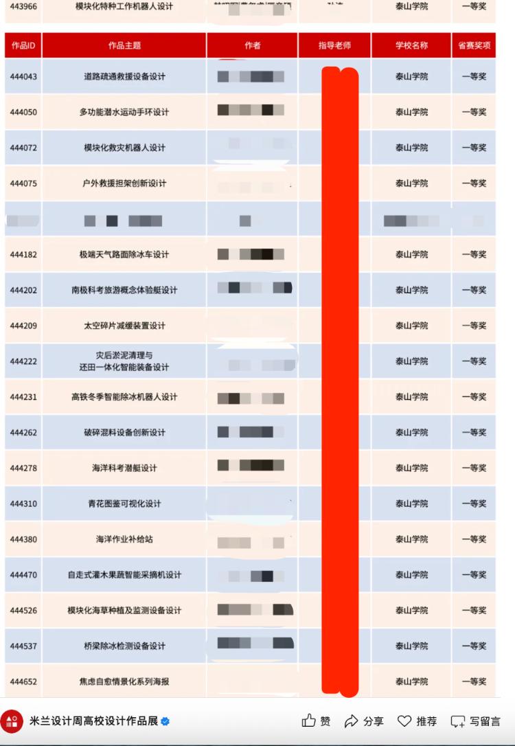 举报人蔡先生则指出,“这个赛事被不少设计类高校师生视为含金量较高的评估依据,直接影响师资绩效、研究生推免、校内荣誉评定等关键环节。”他进一步质疑:“现在撤销泰山学院50多个名额,却没有安排替补,意味着其他高校原本有望晋级的作品也被挤占名额,这对遵守规则的老师和同学来说极不公平。”他呼吁学校对相关责任人进行严肃调查,同时希望赛事方在后续评奖机制中加强原创性审核。“希望以后能杜绝这种靠抄袭获奖的情况,让真正用心创作的学生有公平的展示机会。”