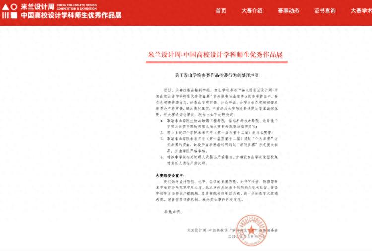 5月30日,“第九届米兰设计周-中国高校设计学科师生优秀作品展”赛事组委会在官网发布《关于泰山学院参赛作品抄袭行为的处理声明》(以下简称:声明)。声明称,组委会接到举报,经泰山学院自查、公众举证、承办院校核查以及组委会审查等多个程序,最终确认该校多个学院提交至“非命题赛场山东赛区”的参赛作品存在大规模抄袭行为,严重违反赛事原创性与学术诚信原则。