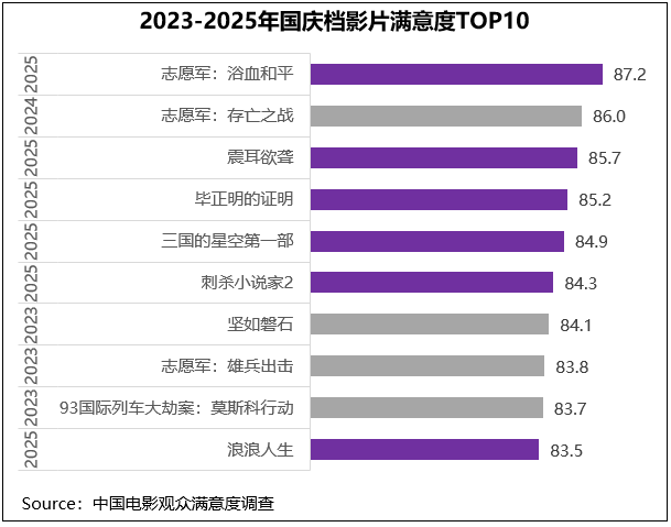 调查的3部IP续作满意度都较前作有所提升。《志愿军:浴血和平》以87.2分居档期首位,分别较系列第一部(《志愿军:雄兵出击》83.8分)、第二部(《志愿军:存亡之战》86.0分)提升了3.4分、1.2分。影片既有对残酷战役现场的宏大呈现,也深入刻画了谈判桌上的激烈博弈,得到了观众的高满意度评价,再度登顶国庆档满意度榜首。
