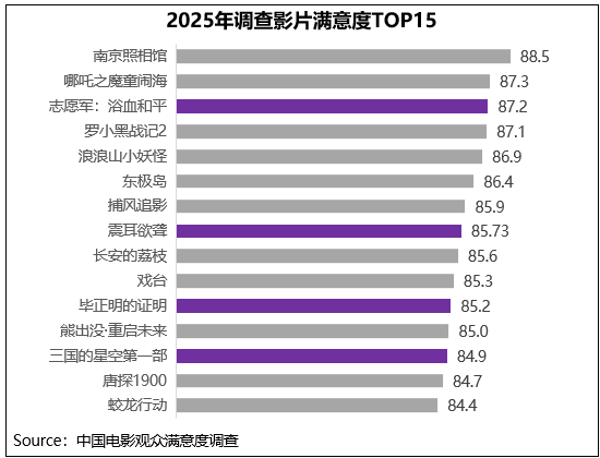 从影片来看,作为抗美援朝“志愿军”三部曲终章的《志愿军:浴血和平》三大指数全面领衔,其中思想性得分88.0分,居2025年第二位,居第一位的是《南京照相馆》88.9分,这两部影片都通过银幕再现残酷战争史实,承载着厚重的民族情感和历史责任感。