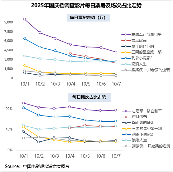 满意度居首位的《志愿军:浴血和平》综合表现较为稳健,票房及排片始终位列第一。档期中段上映的《震耳欲聋》满意度居第二,高口碑支撑下影片上映前三日票房也都居调查影片第二位。