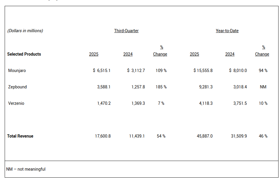 10月30日,美国礼来公司(LLY.US)发布2025年三季报。第三季度营收达到176亿美元,同比增长54%,超出行业预期;净利润达到55.83亿美元,而去年同期为9.7亿美元;每股收益6.21美元,按非公认会计准则(Non-GAAP)计算经调整每股收益7.02美元。