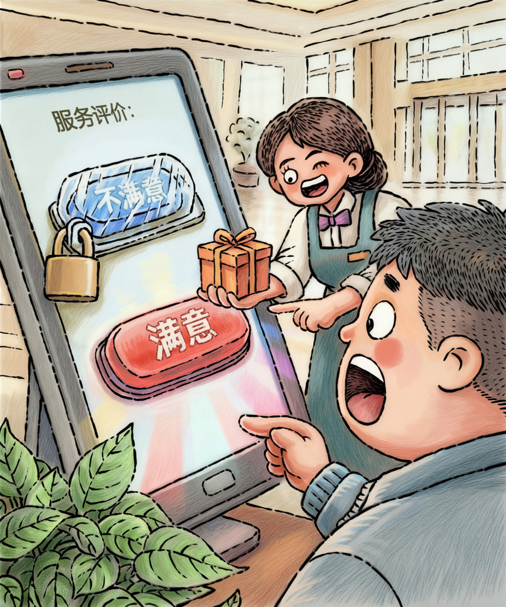 政务服务的评价页面,只能选三星以上的“满意”,否则无法提交;线下营业厅,工作人员“贴心指导”,暗示要勾选“满意”;学校让家长做满意度调查,最低只能打9分……