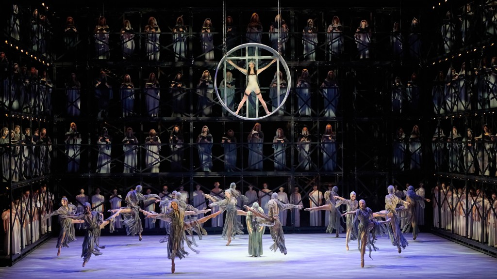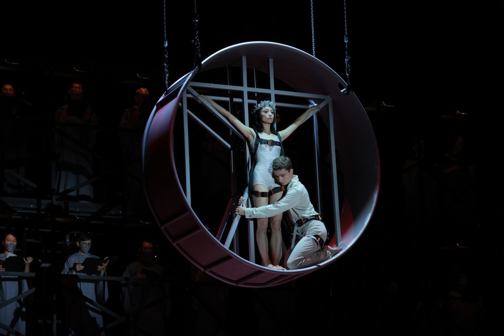 悬于舞台中央高处的轮盘上,舞者以伸展四肢的体态站立其中,仿佛达芬奇名作《维特鲁威人》的复刻——这样的画面正与《布兰诗歌》开篇“哦,命运女神”中的“命运之轮”不谋而合。