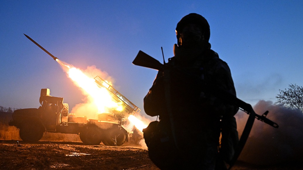 当地时间2025年10月30日,俄罗斯顿涅茨克人民共和国,俄罗斯中部集团军的士兵在俄乌冲突前线波克罗夫斯克方向,操作BM-21“冰雹”多管火箭炮向乌克兰阵地开火。视觉中国 图