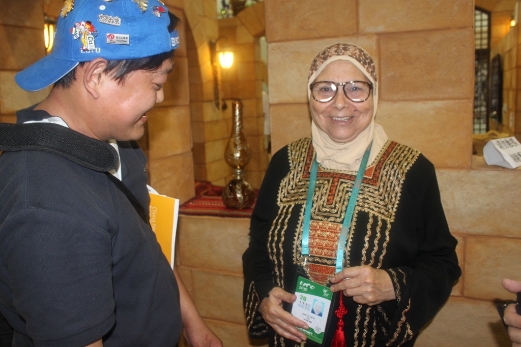 2010年,熊小锋(左)与沙特阿拉伯馆工作人员交流交换徽章。图片由上海世博会博物馆与受访者提供