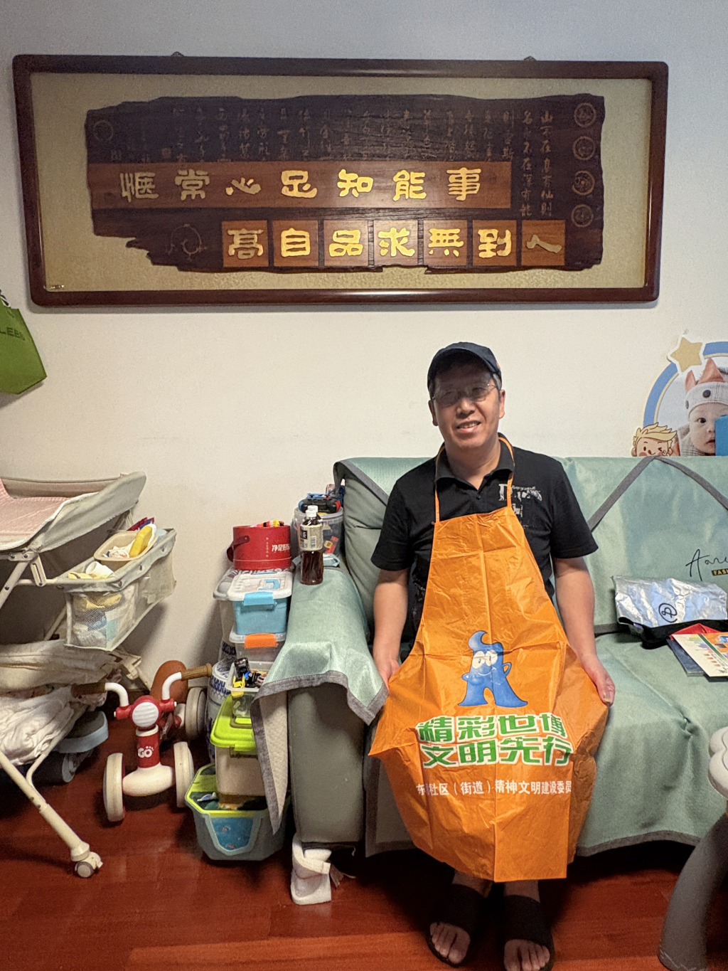 2025年,吕小钢穿着以前街道给居民发放的纪念品围裙。图片由上海世博会博物馆与受访者提供