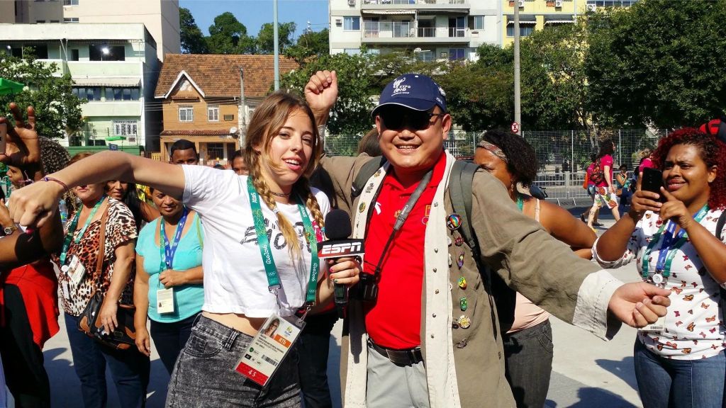 2016年,里约奥运会开幕式当天,熊小锋(右)与ESPN记者互动。图片由受访者提供
