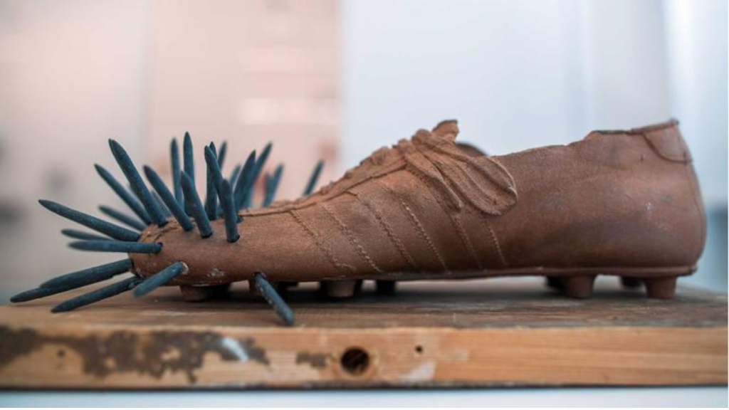 他将钉子放在了日常生活中的物品上,这件作品创作于1972年。这双球鞋的前段被扎满钉子,名字就叫“Spikes”(尖刺),你觉得它想表达什么情绪?