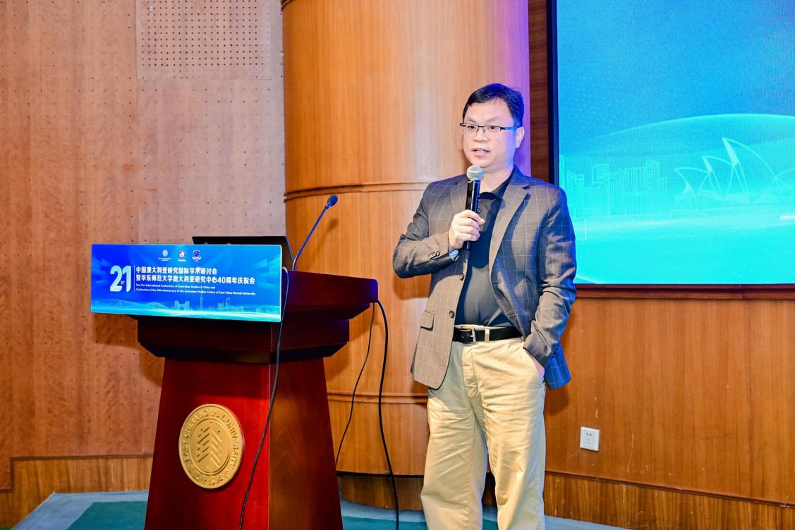 华东师范大学国际合作与交流处处长蒯曙光作主题发言。他立足于学校国际化战略,细数中心依托国际合作实现的突破。他指出,近年来中心已经实现从国别研究到全球视野的升级,澳研工作在服务国家战略与全球治理中正在焕发更强生命力。