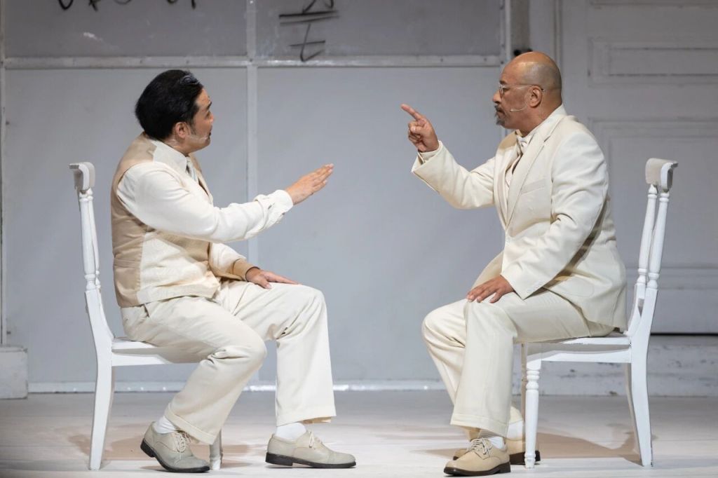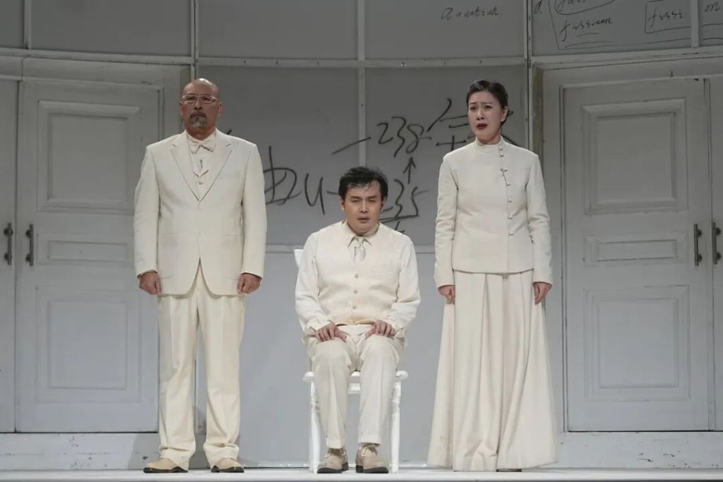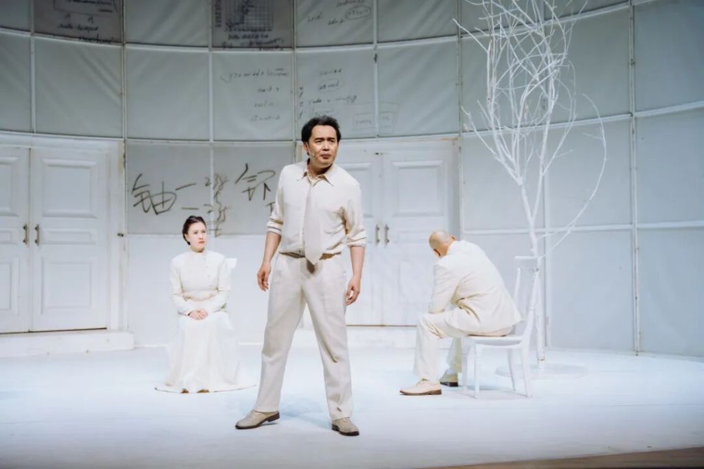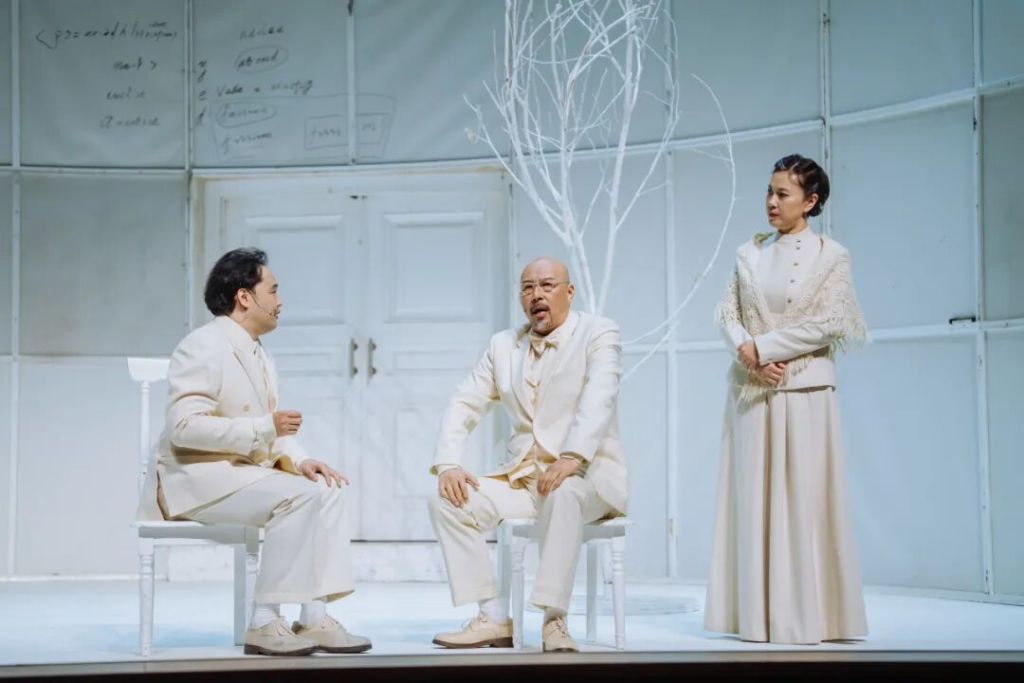 国话版《哥本哈根》以“纯白舞台”构建视觉与哲学的双重仪式。几把白色椅子、一道弧形背景墙和冷调光线,勾勒出极简而高度象征性的美学空间。“白色既是原子弹爆发后的‘归零状态’,也象征灵魂的纯净与历史的空白。”王晓鹰此前在接受采访时强调,这一设计旨在打造“纯粹的理性空间”,让演员如灵魂般飘浮于时间之外。
