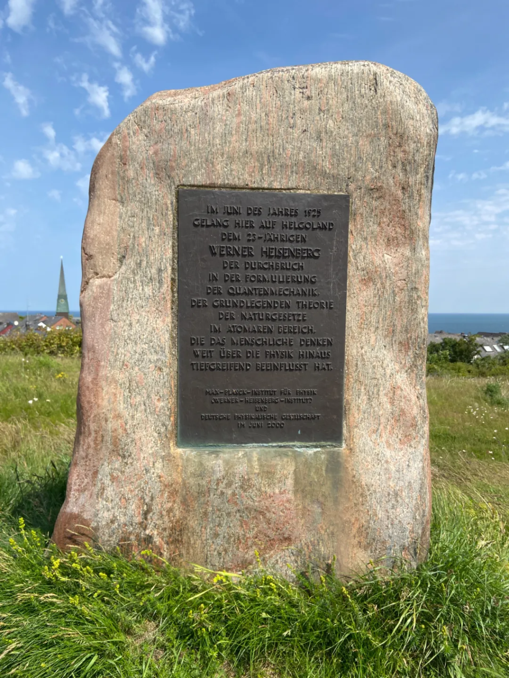 在黑尔戈兰岛,马克斯-普朗克研究所的一块纪念牌匾上写道:"1925年6月,在黑尔戈兰岛,23岁的维尔纳·海森堡在量子力学方面取得了突破性进展,量子力学是原子层面自然规律的基本理论,它对人类思想的影响远远超出了物理学的范畴。"图片:陈晓雪