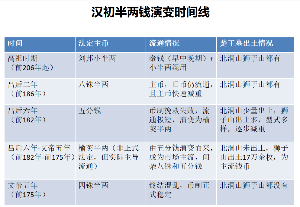 不过,狮子山楚王陵考古发掘队成员之一、徐州市汉兵马俑博物馆馆长葛明宇论证认为,狮子山楚王陵出土的钱币,包括汉初榆荚半两、高后八铢钱、五分钱和文帝四铢半两、以及大量的减重八铢和四铢钱等多种汉代半两币型,因此该墓的钱币时代,应处于文帝五年行四铢半两以后至武帝之前的文景时期。